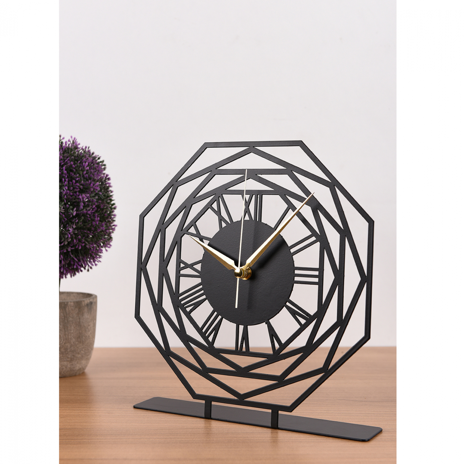 Ρολόι επιτραπέζιο σε μαύρη απόχρωση με χρυσές λεπτομέρειες στους δείκτες.